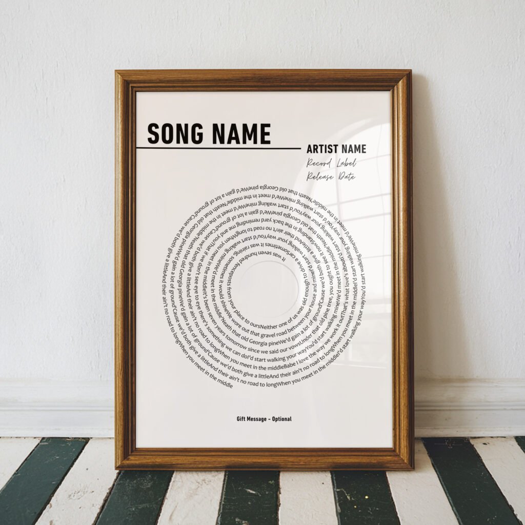 Music has a way of capturing moments, memories, and emotions — and now you can turn your favorite song into a timeless piece of art. Our custom lyric prints transform your most meaningful song lyrics into a stunning keepsake, personalized with your chosen song name, artist, and an optional message. Whether it’s your wedding song, a tune that reminds you of someone special, or just a track that speaks to your soul, this print makes it unforgettable.
