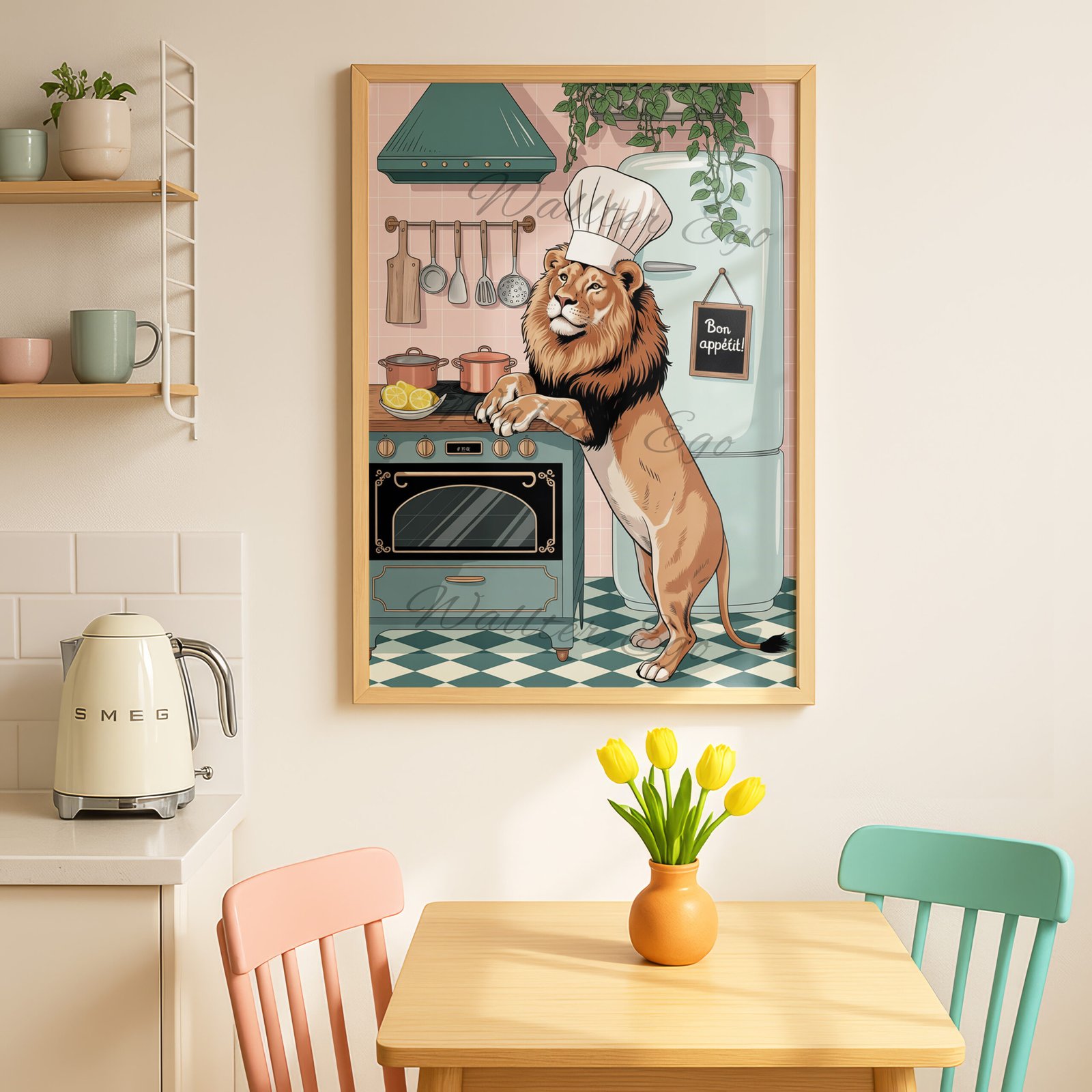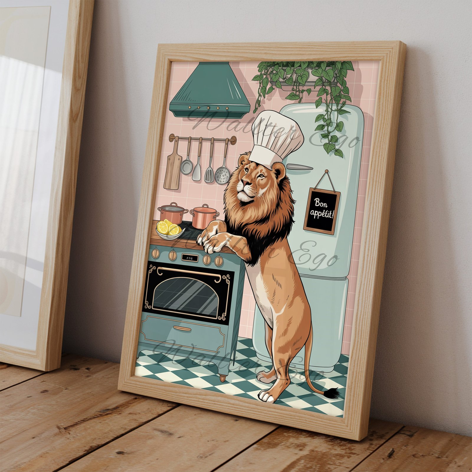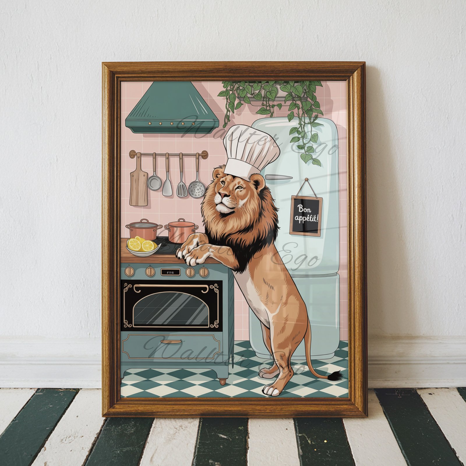 Bring a bold and whimsical touch to your kitchen with this Chef Lion Wall Art. Featuring a proud lion wearing a chef’s hat as he cooks in a retro-inspired kitchen, this playful print makes a great conversation piece. Perfect as funny kitchen wall art, dining room decor, or even as unique man cave decor, it combines humor and style in one striking design. Printed in rich detail, this artwork is ideal for animal lovers, foodies, or anyone who enjoys quirky and cheerful kitchen decor.