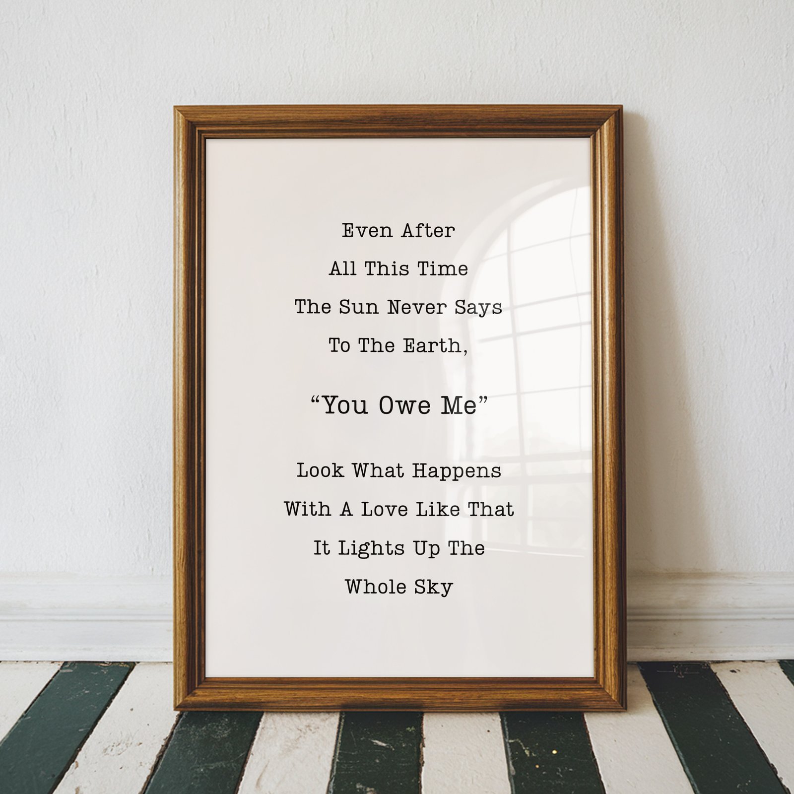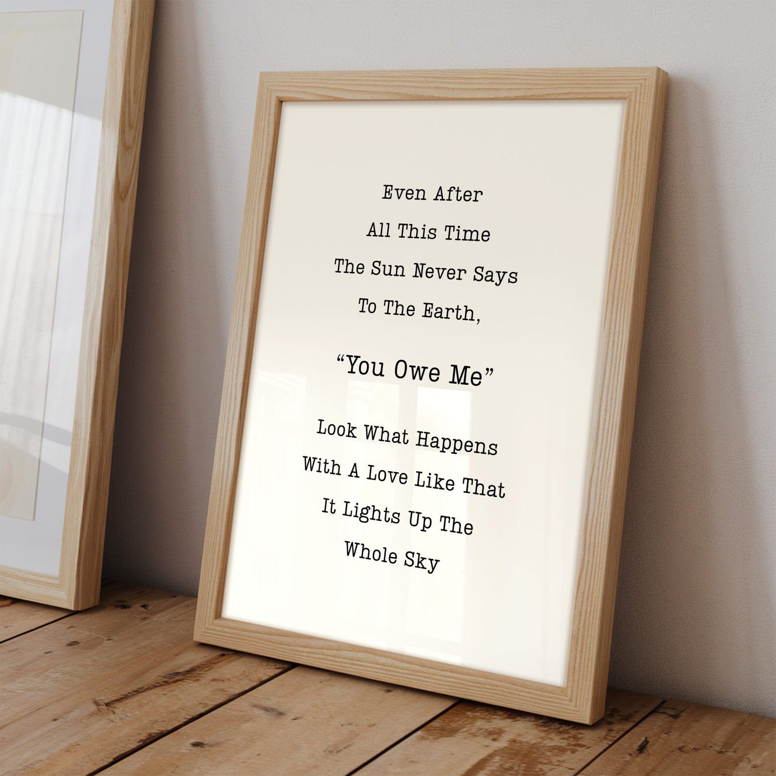 This beautiful quote print, featuring the words, “Even after all this time the sun never says to the earth, ‘You owe me.’ Look what happens with a love like that, it lights up the whole sky,” offers a deep reflection on unconditional love and generosity. With its simple yet powerful typography, this print makes a meaningful addition to any home, spreading warmth and inspiration. Perfect for living rooms, bedrooms, or as a thoughtful gift, it brings a timeless reminder of love’s transformative power and beauty to your space.