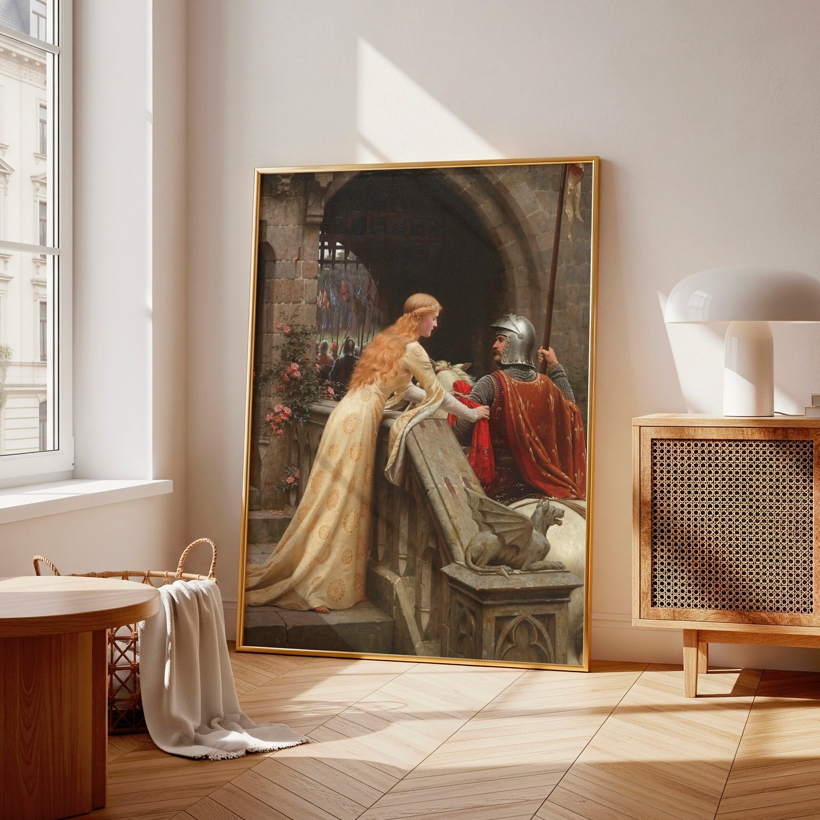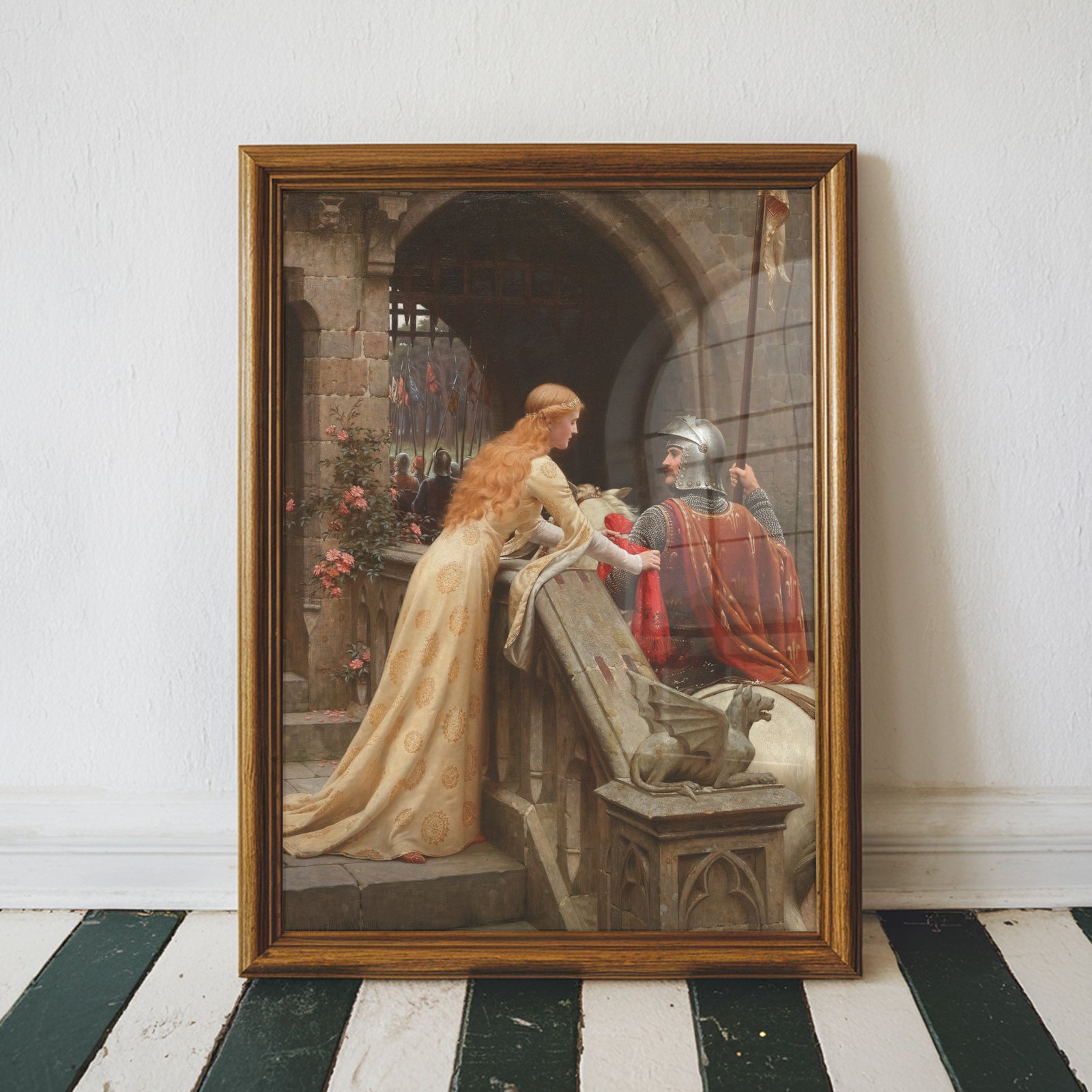God Speed by Sir Edmund Blair Leighton is a romantic and iconic Pre-Raphaelite painting that captures a tender farewell between a knight and his lady. Painted in 1900, it depicts the moment a lady bids goodbye to her departing knight, leaning from a castle balcony as he prepares to ride into battle. With exquisite detail in the lady’s flowing gown, the knight’s shining armor, and the Gothic stonework around them, the artwork evokes themes of love, devotion, and chivalry. This timeless piece is a favorite among collectors of historical and romantic art, making it a stunning addition to any wall art collection.