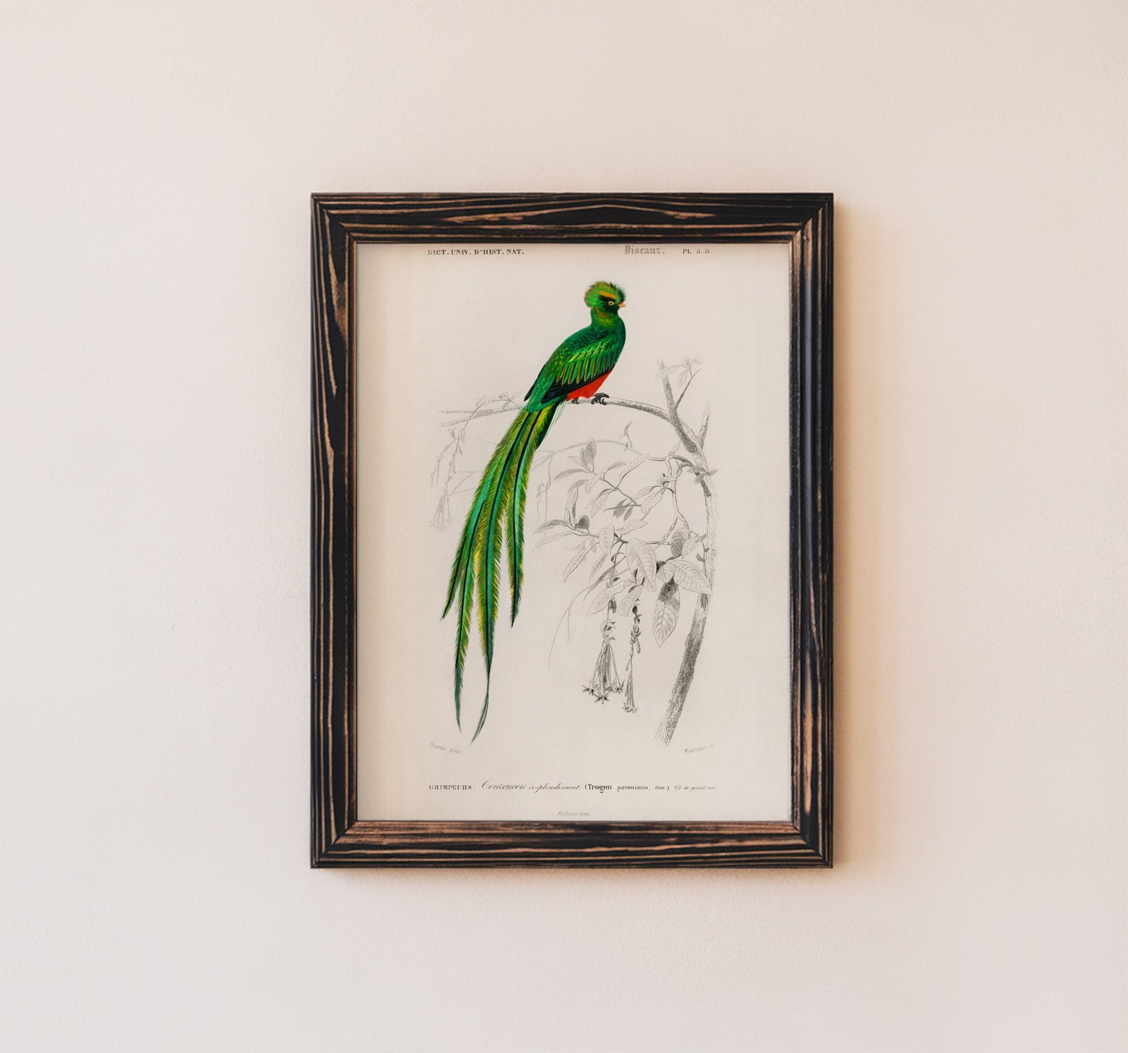 Quetzal Bird by Charles Dessalines d’Orbigny is a stunning vintage illustration that captures the iridescent beauty and exotic allure of this iconic tropical bird. Originally featured in 19th-century natural history works, the artwork combines scientific precision with artistic elegance. With its vivid colors and graceful composition, this piece is perfect for bird lovers, fans of vintage nature prints, or anyone looking to bring a vibrant touch of the tropics into their home decor.