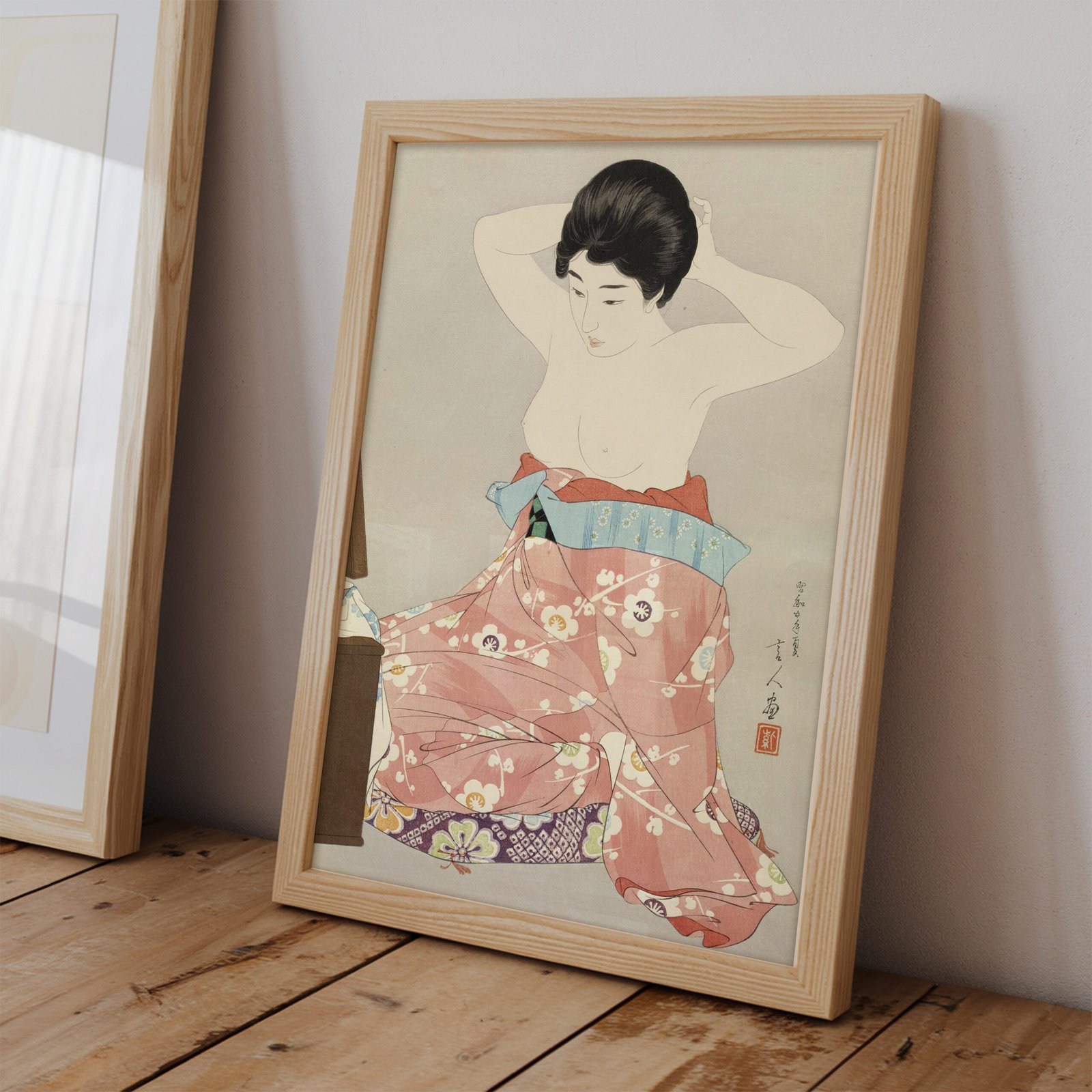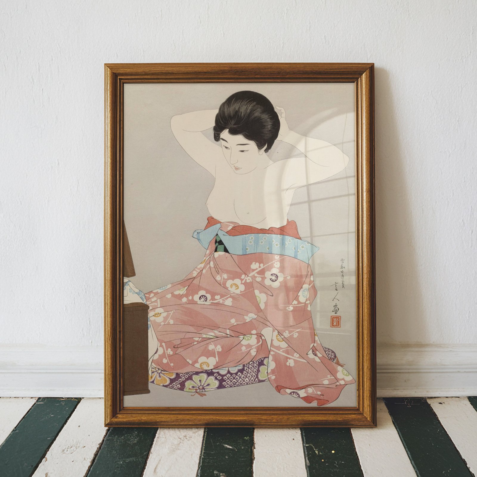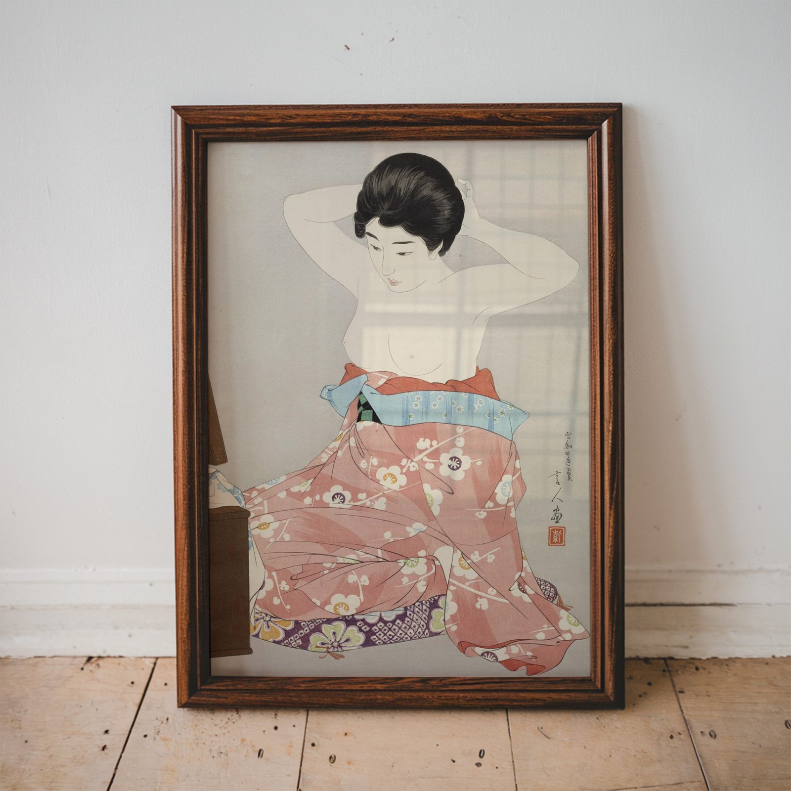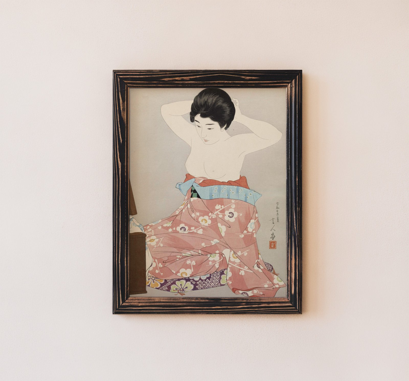 Woman Kneeling Before a Mirror Stand by Torii Kotondo